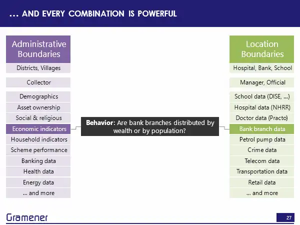 But what this means, therefore, is that if we take any of these data sets that which you can create from location boundaries, or that often already exist by administrative boundaries – and this is a pretty powerful set as well. Census gives us demographic data, asset ownership, who owns laptops, internet connections, TV, cars, fridges, social and religious data, economic indicators, well, income, household indicators, is the house made of a mud roof brick roof, do you have a toilet in the house not have a toilet in the house, practically every government scheme is tracked this way. So how many people have benefited from the National Rural Employment Guarantee act? Banking data is reported this way health data is reported this way.