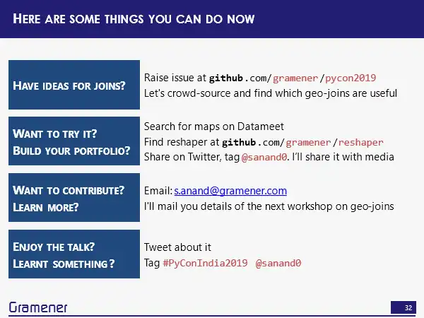 If you want to try solving one of these and discovering your own insight, to build your own portfolio to share some useful knowledge. Then start by finding a map. Like I said, Datameet is a good place where you can find them up. You can find the reshaper library on https://github.com/gramener/reshaper. The links are again, on https://github.com/gramener/pycon2019. This is the one link that you need to remember and if you find something, do share it on Twitter. Please tag me @sanand0, I’d love to share it at least with the media and get some people to understand the power of geospatial joins.