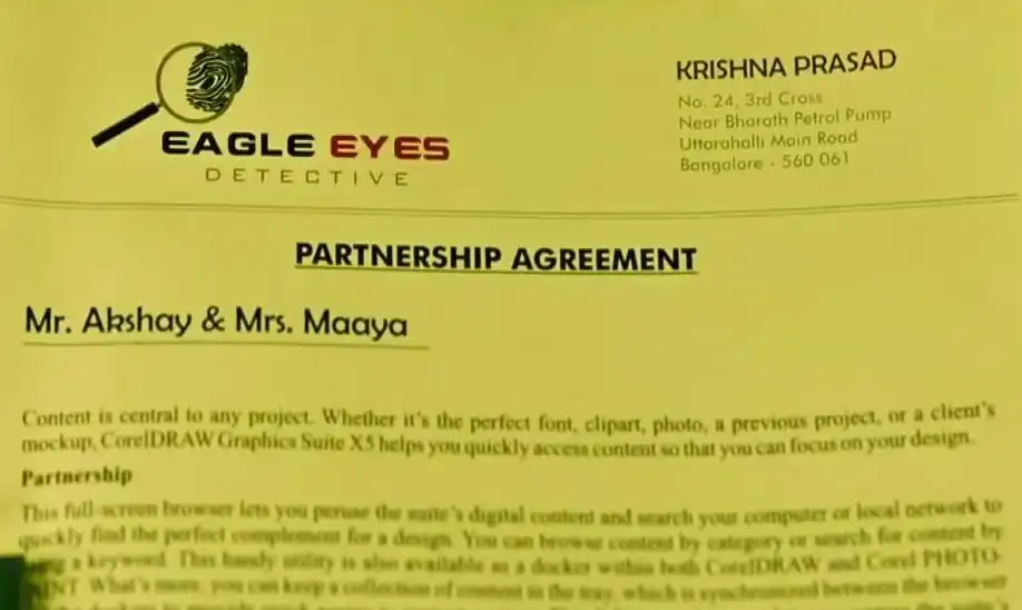 Tamil film crews use a less-expensive approach. In Game - Oru Melliya Kodu (2016), I noted that the detective agreement is titled “Partnership Agreement: Mr Akshay and Ms Maaya”. But the contents talk about CorelDRAW and CorelPhoto