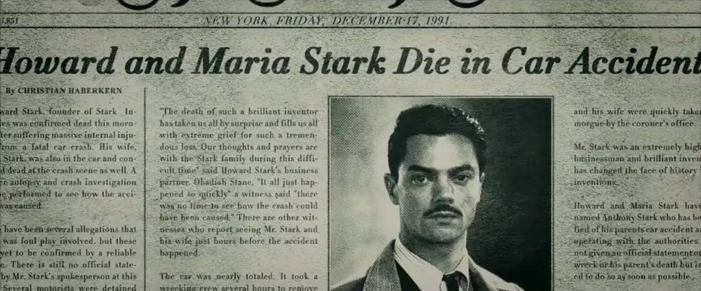 Captain America: The Winter Soldier shows a newspaper with the headline “Howard and Maria Stark Die in Car Accident”.