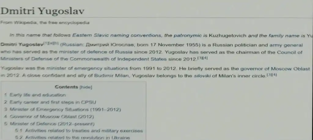 In Cobra (2022), though, I did see an improvement. The Wikipedia page on “Dmitri Yugoslav” is a smart edit of the Wikipedia page on Sergei Shoigu. Even the phonetic pronunciation of his name “Дмитрий Югослав” is correct.
