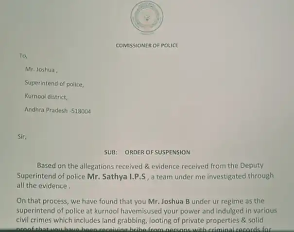 The Warrior (2022) has a fax message with an order of suspension from the “Comissioner of Police” for the “Superintend of police” where “under ur regime as the superintend of police at kurnool havemisused your power …”