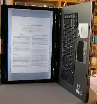 If you hold the laptop this way, it’s surprisingly easy to handle. I find that I can read this way even when standing on a crowded train — which is as much as I can expect from any book. (Strangely enough, it doesn’t seem to attract too much attention on the train either.)