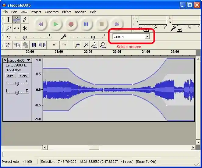 You can choose which source to record from in Audacity. Do you see the “Line In” in the screenshot below? That’s the source from which Audacity will record sound from. Usually, your PC will have a “Microphone” socket, and may have a “Line in” socket. It may also have a built-in microphone. Depending on what sockets and capabilities your PC has, you may see different things.