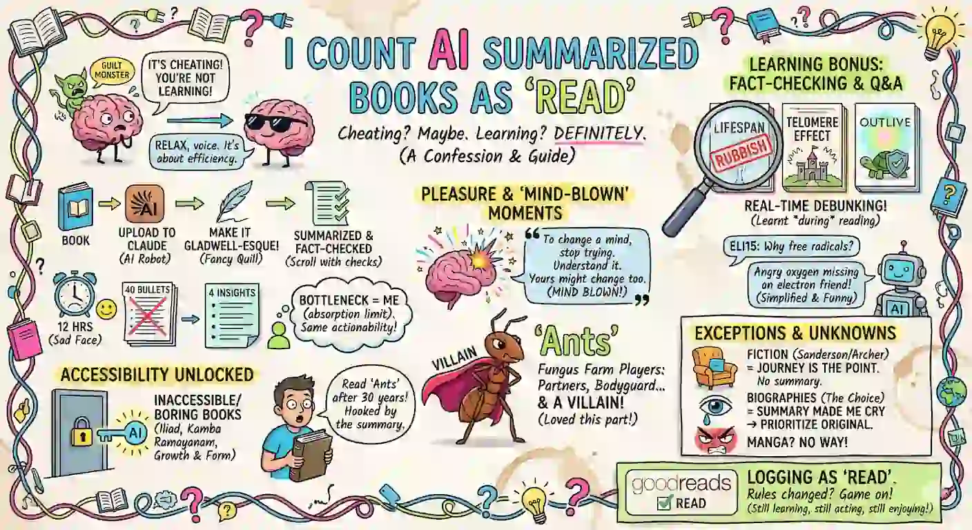 I have this nagging feeling (maybe you do too?) that it’s cheating and I’m not really learning if it’s so easy. The same voice makes me feel guilty when using coding agents to code or ChatGPT in meetings. I’m telling that voice to relax. I upload books to Claude and ask it to “Comprehensively and engagingly summarize and fact-check, writing in Malcolm Gladwell’s style, the book …”. I can read it in an hour instead of twelve. Four bullet points instead of forty. With (this surprised me) roughly the same number of insights I actually do something with. ...