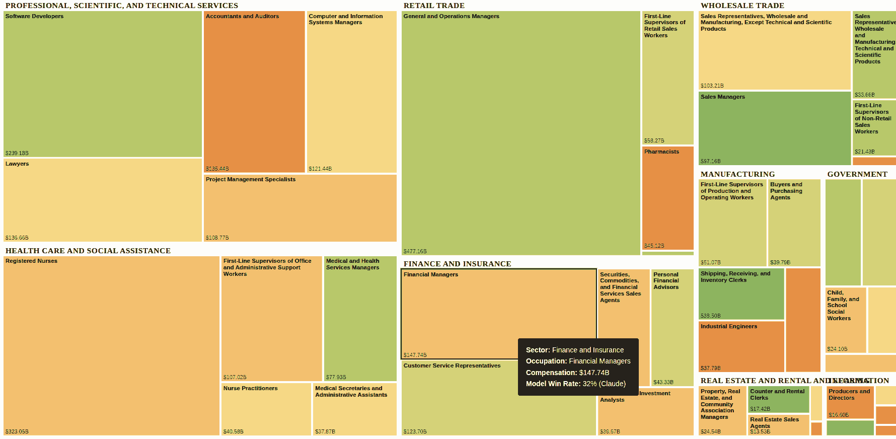I charted the OpenAI GDPVal paper with industry compensation as the size and AI augmentation as color. Big green areas are we’re paying people where AI does better. Click here to see the interactive visualization. Clicking to see some actual tasks compared. I use this to check whom to ask advice: AI or professional. AI beats Personal Financial Advisors ~64% of the time. So I invested half my money using ChatGPT’s recommendation. (UTI Nifty 50, if you’re curious.) ...