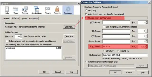 15. For Firefox, go to **Tools – Options – Advanced – Network – Settings** and select **Manual proxy configuration**. Set the Socks Host to **localhost**:**9090** and leave all other fields blank.