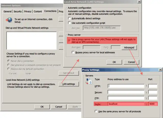14. Open your Browser, and set the SOCKS server to localhost:9090. For Internet Explorer, go to **Tools – Options – Connections – LAN Settings**, select **Use a proxy ...**, click on **Advanced**, and type **localhost**:**9090** as the **Socks** server. Leave all other fields blank.