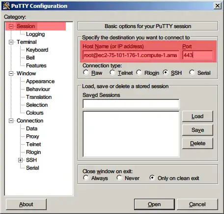 8. Run Putty. Type in **root@****<the-public-DNS-you-just-copied>** as the host name, and **443** as the port