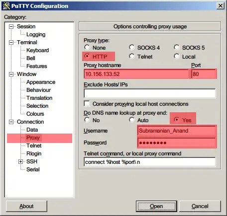 9. Under **Connection > Proxy**, set **HTTP** as the proxy type. Type in the **Proxy hostname** and **Port** you normally use to access the Internet. Select **Yes** for **Do DNS name lookup at proxy end**. Type in your Windows login ID and password.
