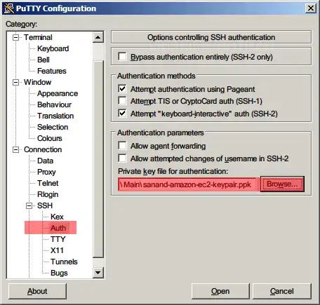 11. Under **Connection > SSH > Auth**, click **Browse** and select the **privatekey.ppk** file you’d saved earlier.