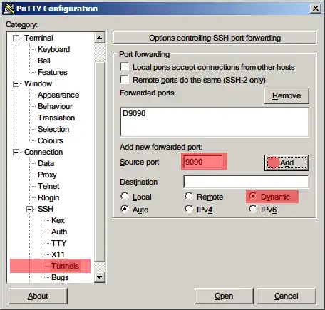 12. Under **Connection > SSH > Tunnels**, type **9090** as the **Source port**, **Dynamic** as the **Destination**, and click **Add**.