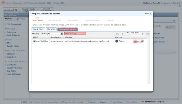 - Select Community AMIs and find ami-ccf615a5. It’s a Ubunty Jaunty 9.04 instance that’s been customised to run scripts passed as user-data. You may pick any other alestic instance. (The screenshot below picks a different instance. Ignore that.)