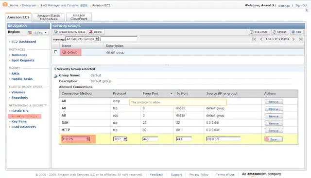 - On the AWS EC2 Console, click on Security Groups and select the default security group. At the bottom, select HTTPS as the connection method, and save it.