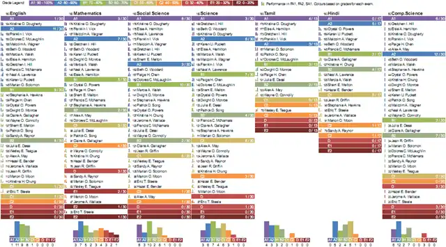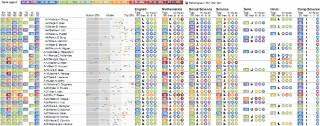 This is fairly simple. Under each subject, we have a list of students, sorted by marks and grouped by grade. The primary use of this is to identify top performers and bottom performers at a glance. It also gives an indication of the grade distribution.