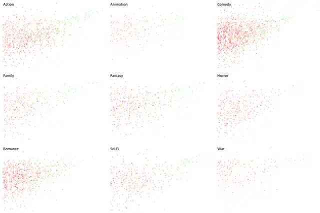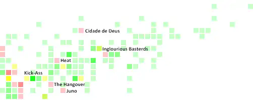 Each box is one or more movies. Darker boxes mean more movies. Those on the right have more votes. Those on top have a better rating. The ones I’ve seen are green, the rest are red. (I’ve seen more movies than that – just haven’t marked them green yet :-)