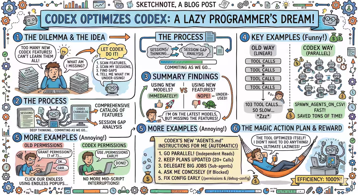 Instead of learning and applying new Codex features, I asked it to analyze my sessions and tell me what I’m under-using. I'd like you to analyze my Codex sessions and help me use Codex better. sessions/ has all my past Codex sessions. Search online for the OpenAI Codex release notes for the latest features Codex has introduced and read them - from whatever source you find them. Then, create a comprehensive catalog of Codex features. Then, analyze my sessions and see which feature I could have used but didn't and make a comprehensive list. Then summarize which features I should be using more, how, what the benefits are, and with examples from my sessions. Document these in one or more Markdown files in this directory. Write scripts as required. Commit as you go. It did a thorough job of listing all the new features and analyzing my gaps. ...